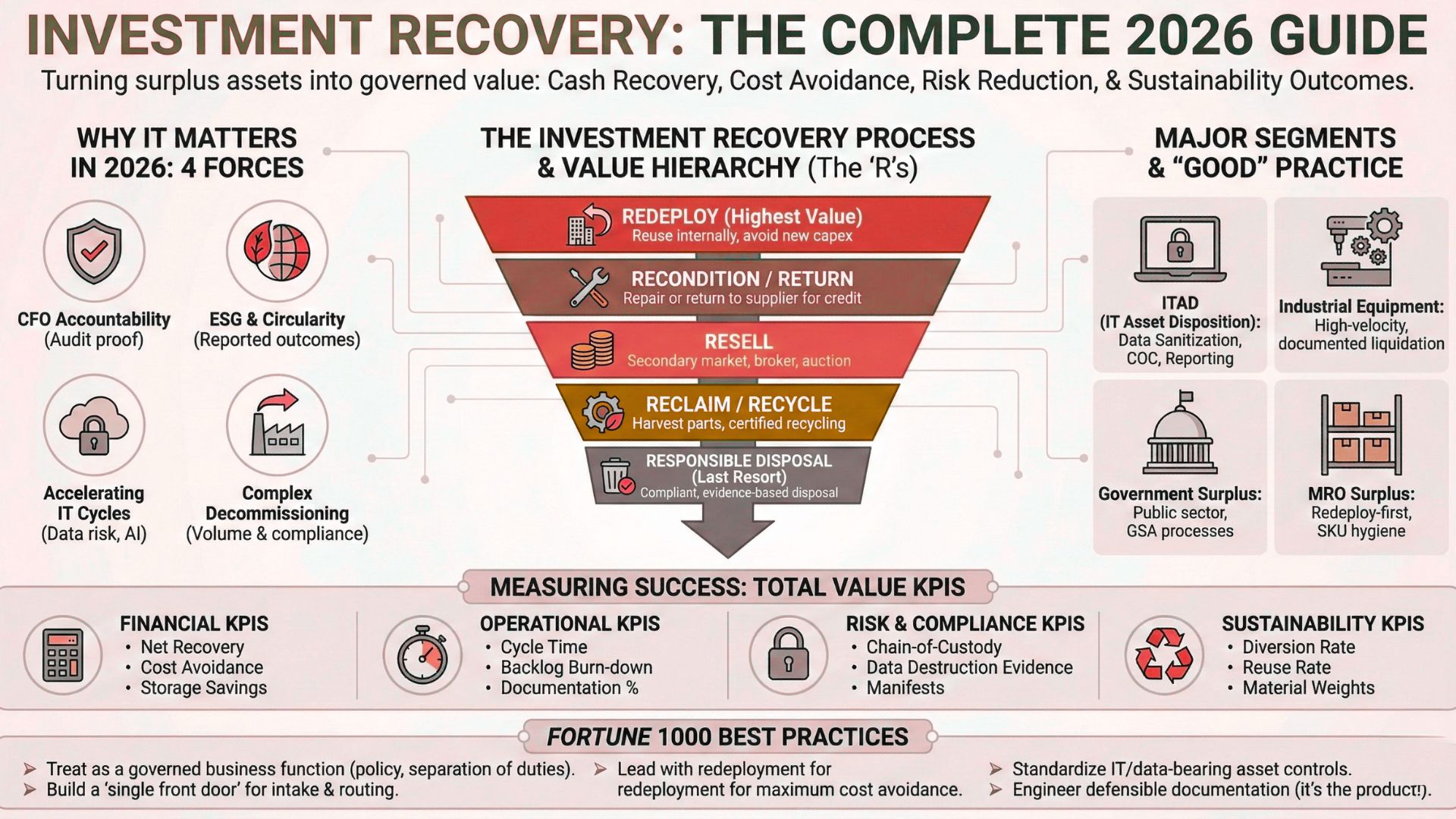 - Investment recovery is the professional, governed process of turning idle, surplus, obsolete, and end-of-life assets into measurable cash recovery, cost avoidance, risk reduction, and sustainability outcomes.
